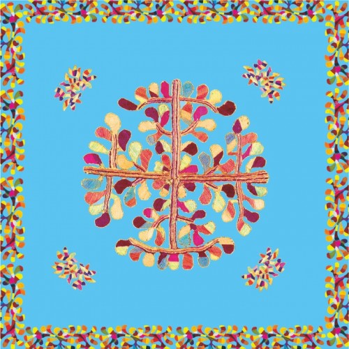 맑은 하늘을 연상시키는 밝은 시안 컬러 바탕에 어우러진 화목문양